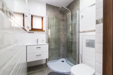 nowoczesna kuchnia z pełnym wyposażeniem, salon z TV, kominek, 2-osobowa kanapa z funkcją spania, fotele, stół łazienka: prysznic, umywalka, WC